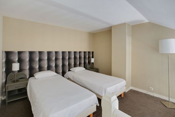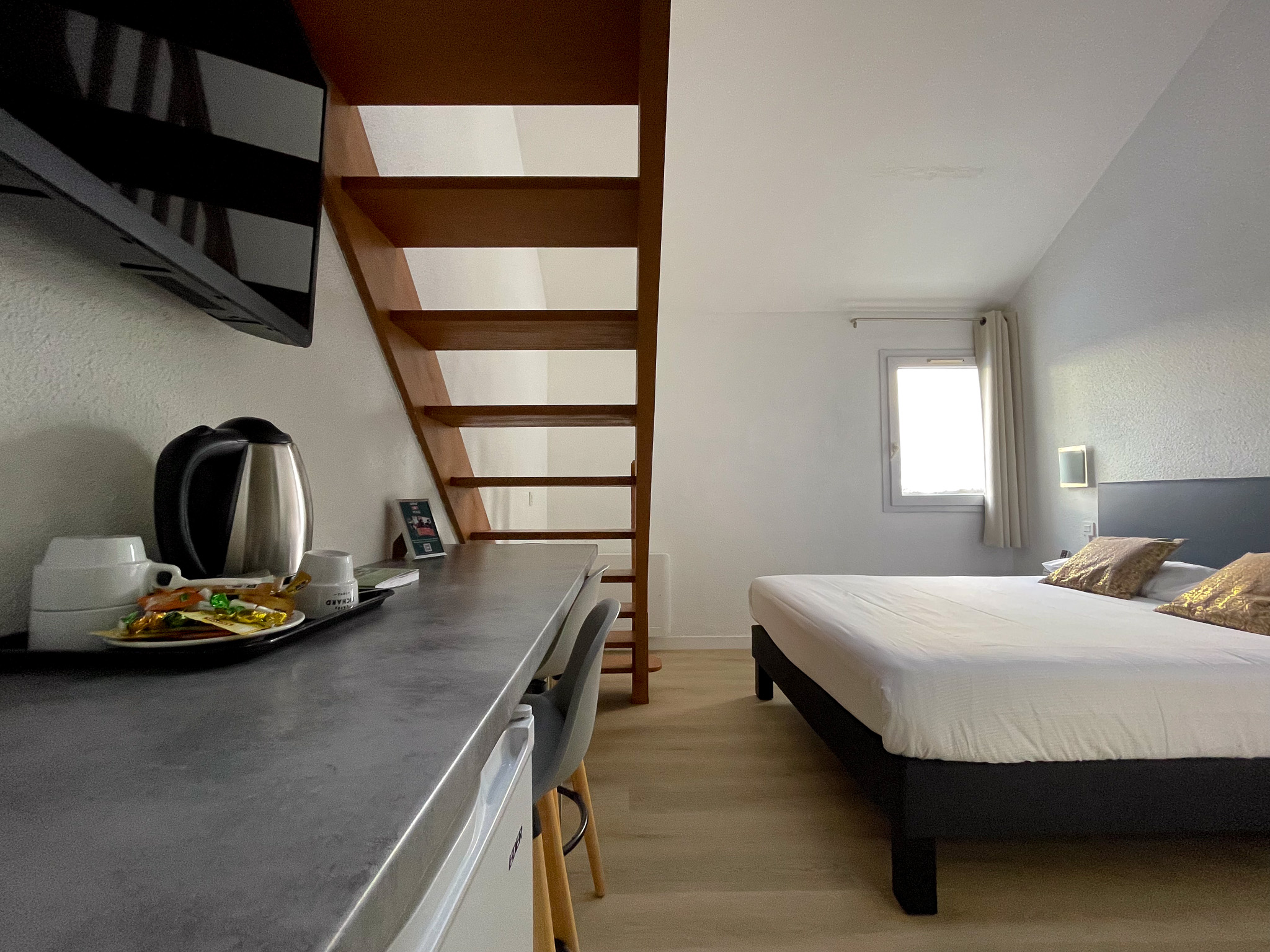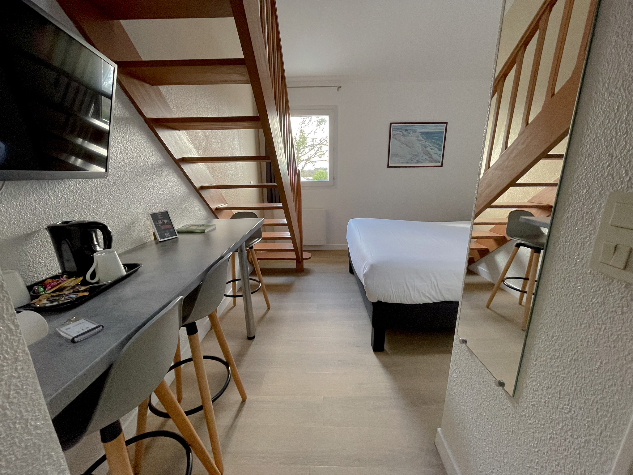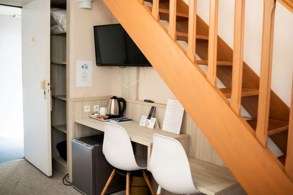 Our Duplex Family rooms can accommodate up to 5 people and have a mezzanine bedroom. Located on the 1st floor, they are very spacious, quiet and comfortable.