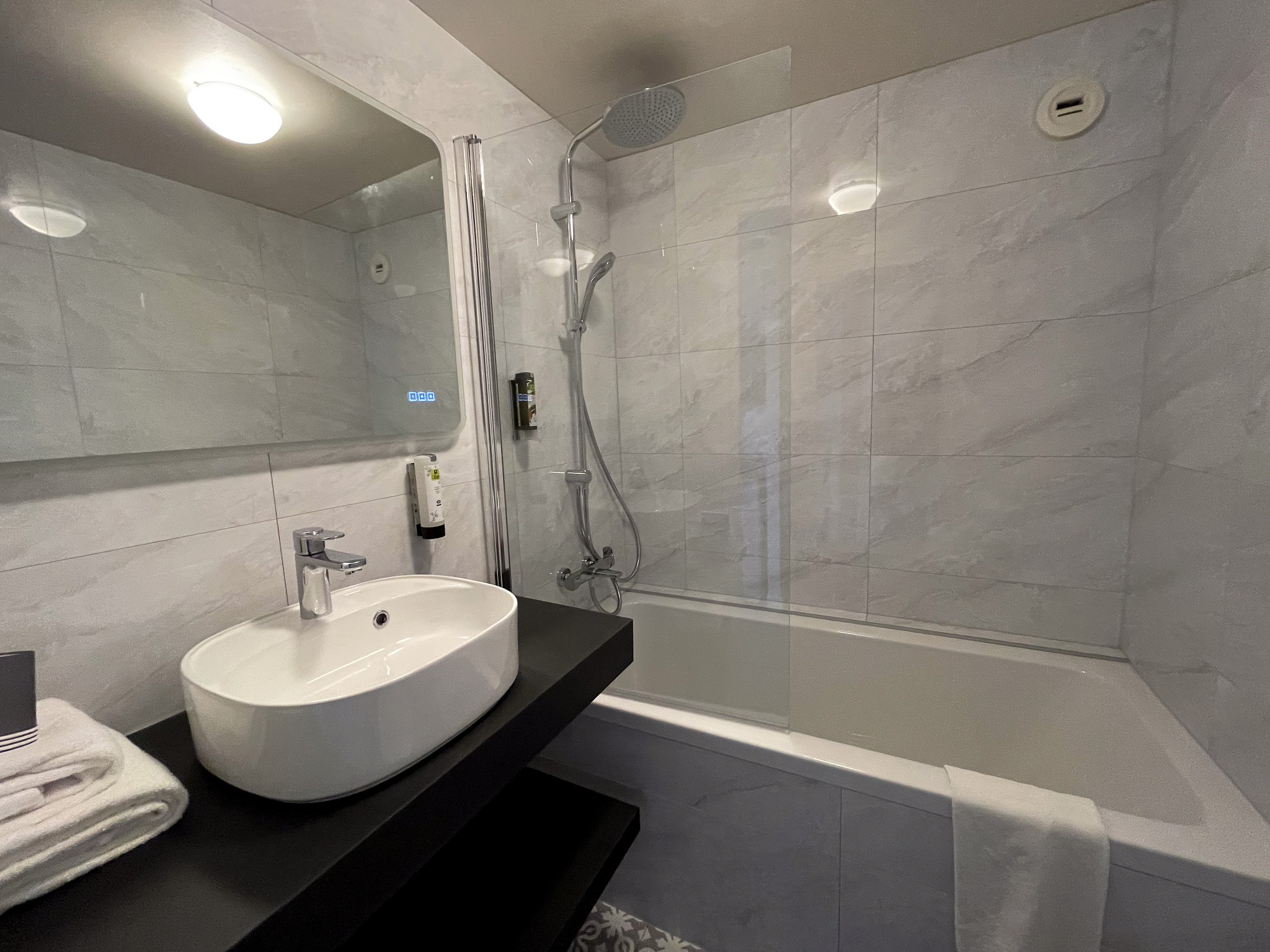 - a double bed in 160x200cm Queen size with duvet, two single beds upstairs and a bathtub for the room accommodating 3 or 4 people. Bathroom with renovated walk-in shower or bathroom with bathtub.