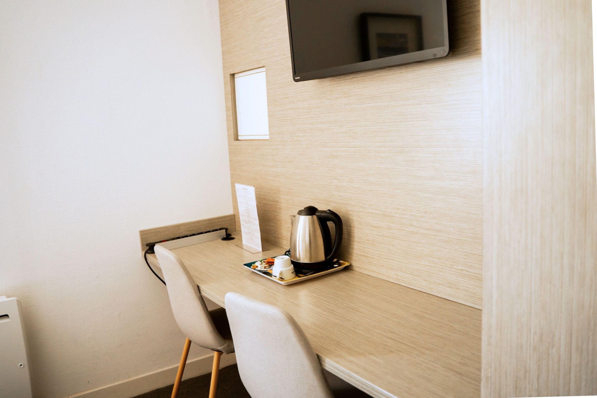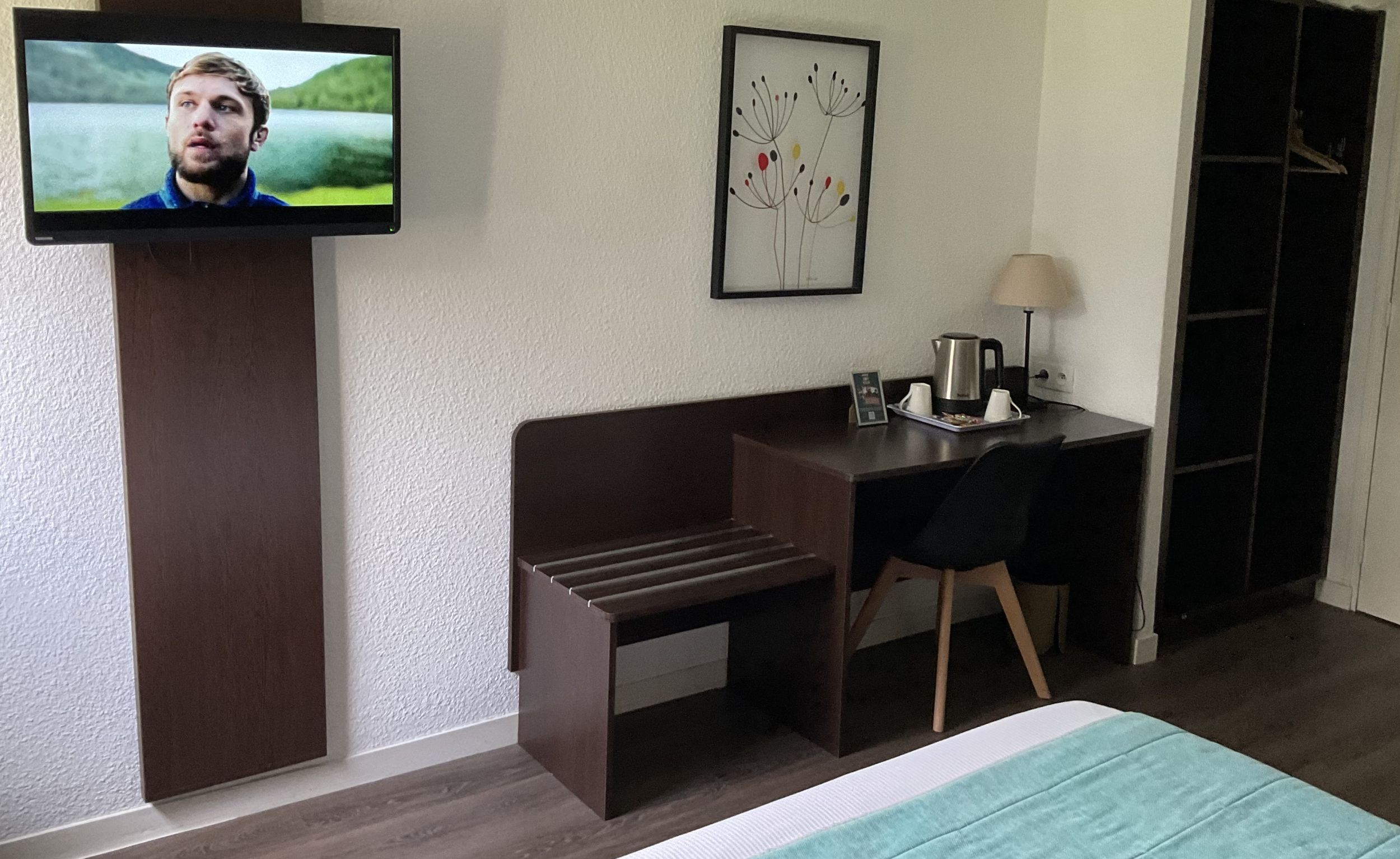This quiet, simple and comfortable room has a double bed with duvet (Twin beds possible), a flat screen TV, a desk area and a wardrobe/wardrobe.