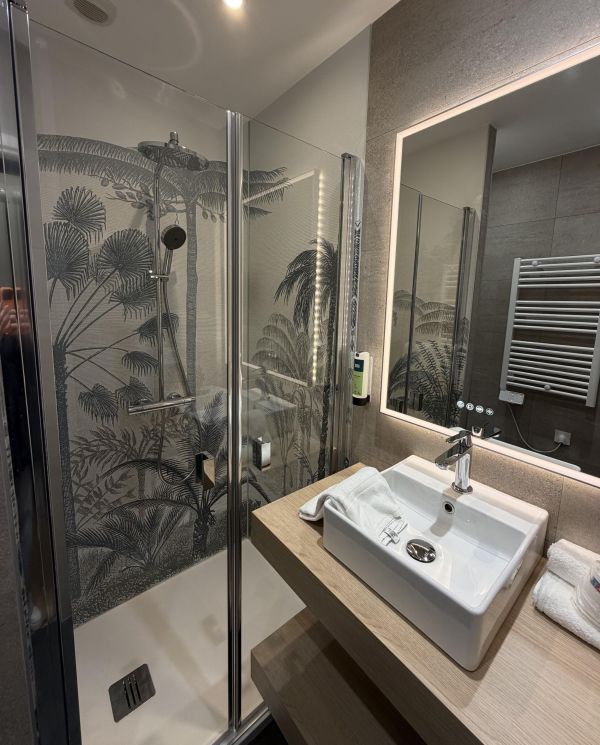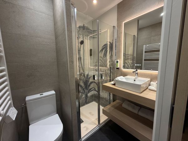 Sa salle de bain privative avec douche à l'italienne et radiateur sèche serviette est pourvue d’un sèche-cheveux et de produits de toilette.